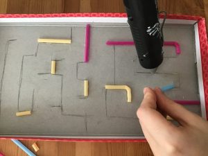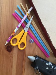 Als nächstes schneidet Ihr die Strohhalme vorsichtig mit einer Schere, passend zu Eurer Skizze und klebt sie sodann mit der Heißklebepistole in den Schuhkartondeckel. Tragt bei diesem Schritt Handschuhe oder bittet eine*n Erwachsene*n um Unterstützung!