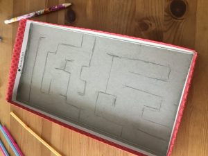 Malt im ersten Schritt mit einem Bleistift ein Labyrinth-Muster in Deckel des Schuhkartons.