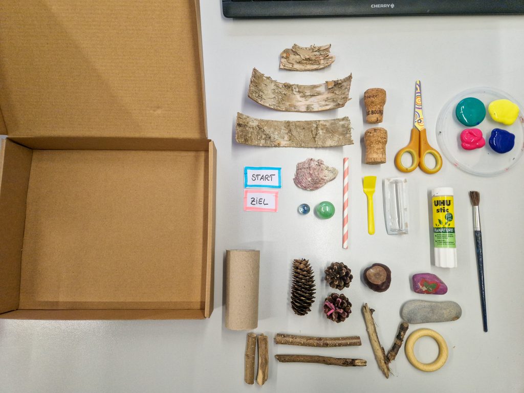 - Naturmaterialien (z.B. kleine Stöcke, Steine, Tannenzapfen, Kastanien, Baumrinden, Muscheln)