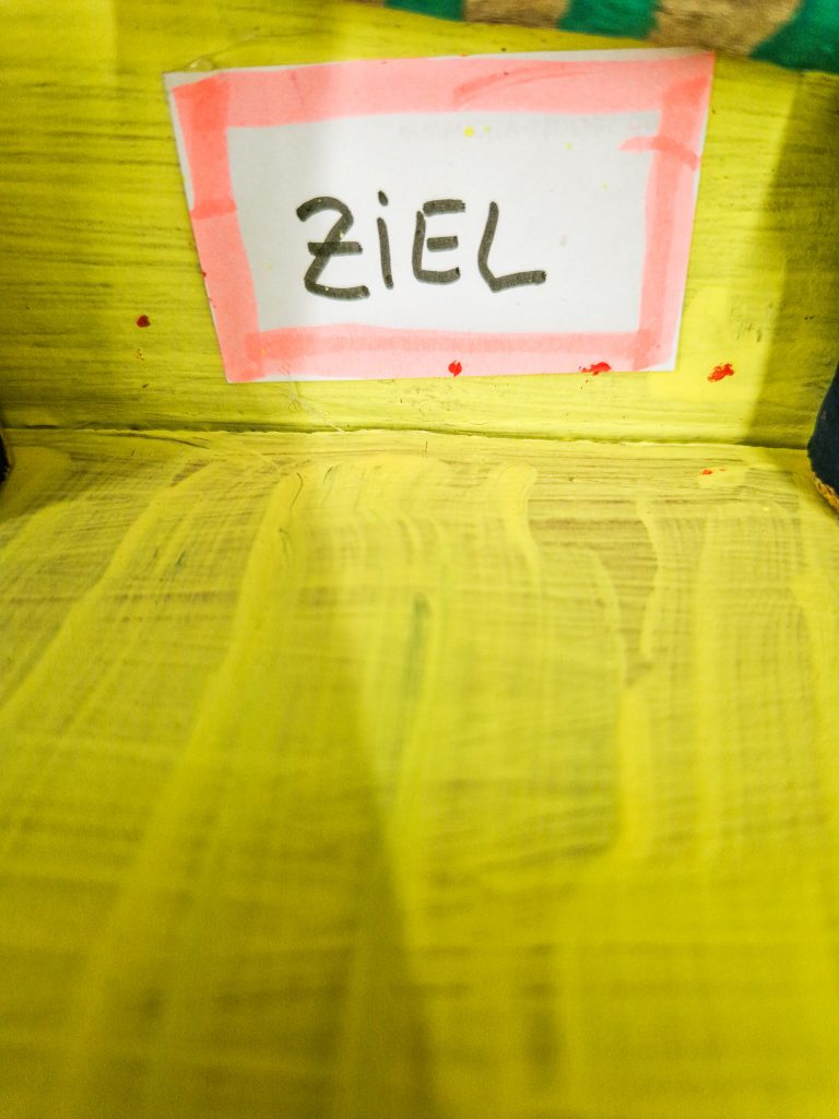 2. Danach schreibt Ihr auf die Zettel „Start“ und „Ziel“. Die Zettel könnt Ihr natürlich auch noch bemalen. Klebt Eure Schilder für „Start“ (links oben ins Eck) und „Ziel“ (rechts unten ins Eck) in den Karton.