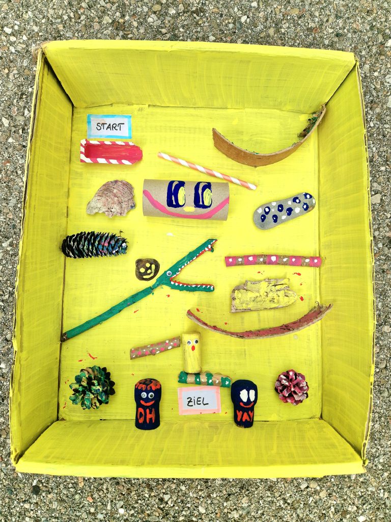Eine kleine abenteuerliche Reise zum Mitnehmen? Das geht mit Eurer selbstgebauten Murmelbahn im Karton! Baut knifflige Hürden ein, die Eure Murmel durch verschiedene Umwege über Stock und Stein, durch Tunnel und über Halfpipes ins Ziel führen. Dafür könnt Ihr zum Beispiel Naturmaterialien benutzen oder Materialien die ihren Zweck schon erfüllt haben und im Papierkorb landen würden.