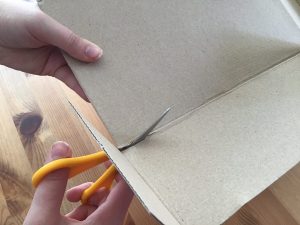 Als erstes schneidet Ihr den Boden Eures Schuhkartons mit einer Schere aus. Das klappt am besten, wenn Ihr den Schuhkarton auseinanderfaltet.