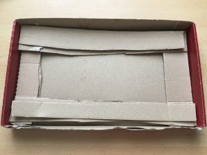 Während das Ganze trocknet, könnt Ihr schon einmal beginnen, die Unterkonstruktion für den Schuhkartondeckel zu basteln. Dafür schneidet Ihr aus den übrigen Seitenteilen je zwei gleichlange Pappstreifen aus, legt sie in den Schuhkartondeckel und klebt sie mit Heißkleber fest.