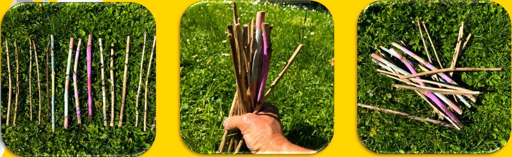 Sammelt im Wald oder in einem Park ungefähr 16 gleichgroße Stöcke. Nun müsst Ihr die Stöcke noch anmalen, damit Ihr diese beim Spielen auseinanderhalten könnt. Hierfür könnt Ihr die Hälfte der Stöcke „naturfarben“ lassen oder Ihr malt die Stöcke in zwei unterschiedlichen Farben an. Gerne könnt Ihr diese noch mit Mustern verzieren.