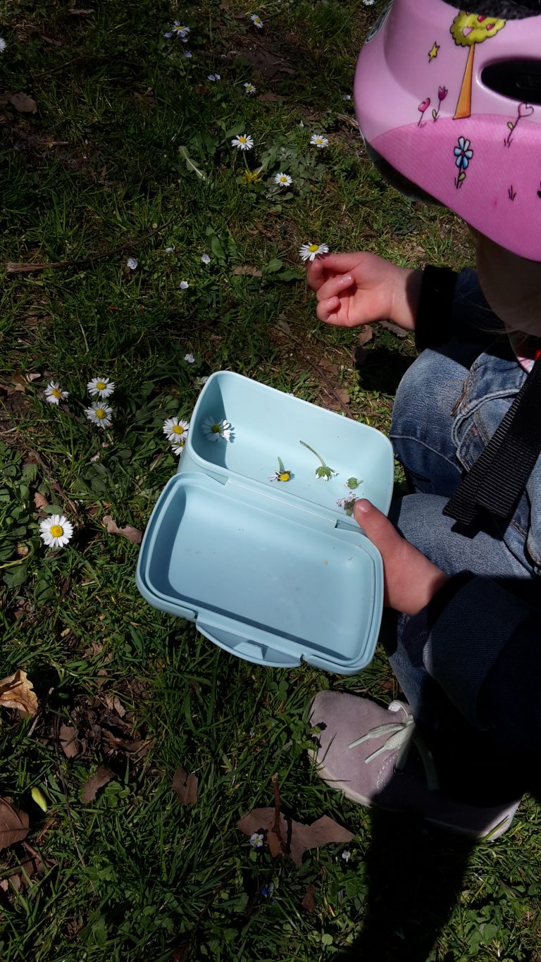 Zu Hause angekommen, können die Naturschätze gesäubert (z.B. Steine waschen), versorgt (z.B. Äste mit Blüten in ein Glas mit Wasser stellen) und erforscht werden: Welchen Schatz habe ich da gefunden? Wie fühlt er sich an? Wie verändert er sich, wenn ich ihn mit Wasser verbinde oder trocknen lasse?