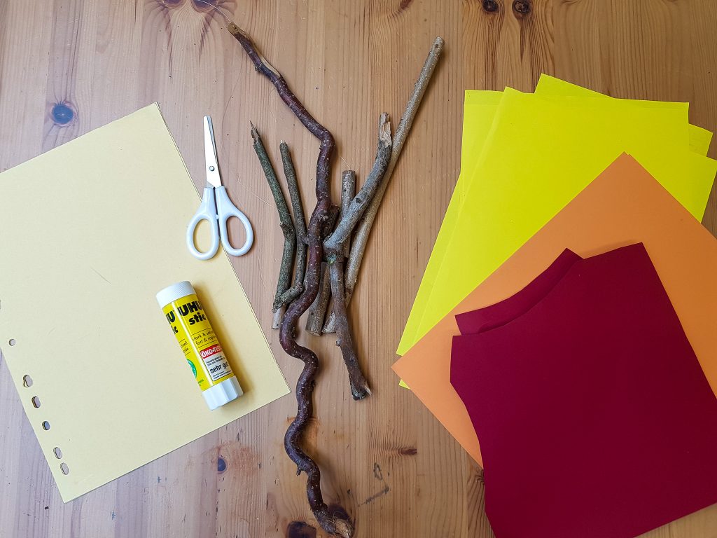 3. Steckt die beiden Flammen ineinander und dekoriert sie mit den Stöcken. Fertig!