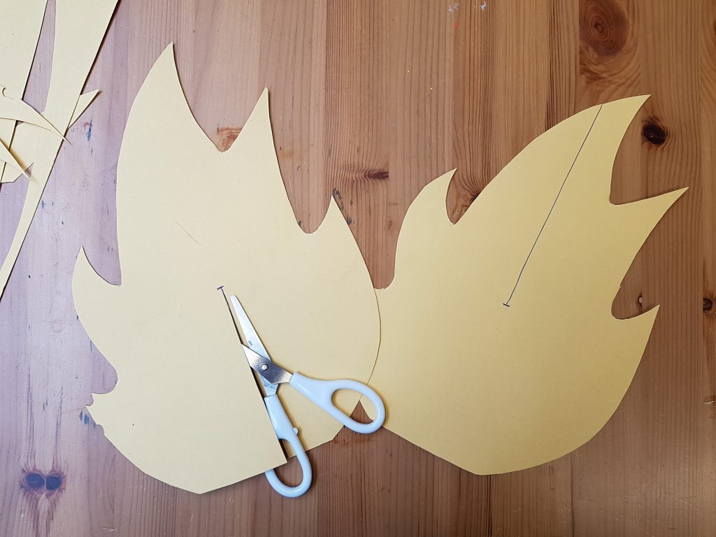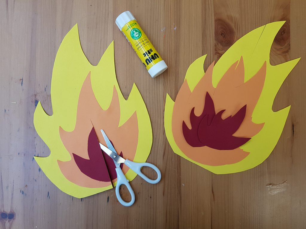 1. Schneidet aus dem Pappkarton zweimal den Umriss eines Lagerfeuers aus. Wenn Ihr mögt, könnt Ihr die Vorlage verwenden. Den ersten Feuerflammen-Umriss schneidet Ihr von unten gerade bis zur Mitte ein, den zweiten von oben gerade bist zur Mitte. Hier werdet Ihr sie später zusammenstecken.