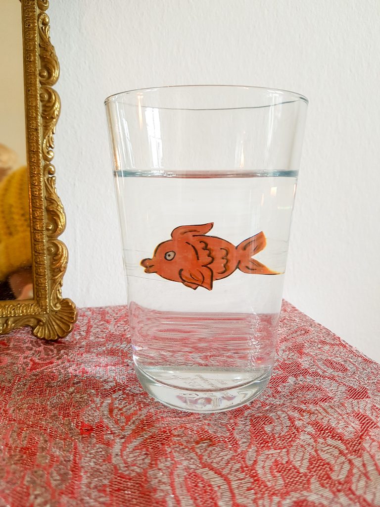 *Wahrscheinlich wollt Ihr auch keinen Fisch in ein enges Glas einsperren, wie es leider oft noch gemacht wird. Es reicht aber völlig aus, ein Fisch zu malen, auszuschneiden und hinter ein Glas mit Wasser zu kleben!
