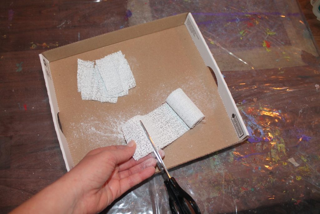 1. Zunächst bereitet Ihr alle benötigten Materialien vor und deckt am besten auch Euren Arbeitstisch mit einer Plane oder wasserabweisenden Tischdecke ab, so dass nichts voll Gips werden kann. Zudem empfiehlt es sich den Gips in Streifen zu schneiden, so dass Ihr gleich zügig arbeiten könnt.
