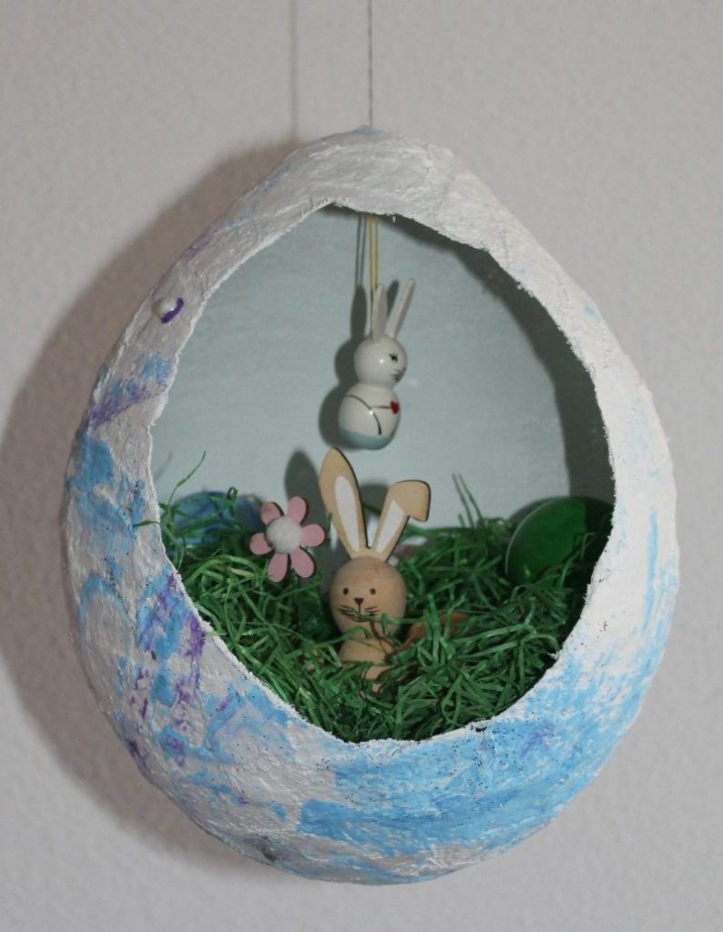 5. Nun könnt Ihr das Ei aufhängen und mit Ostergras oder noch besser mit Heu, Stroh oder Ästchen, Ostereiern oder anderen Überraschungen schmücken. Viel Spaß!