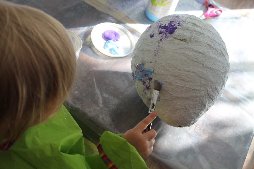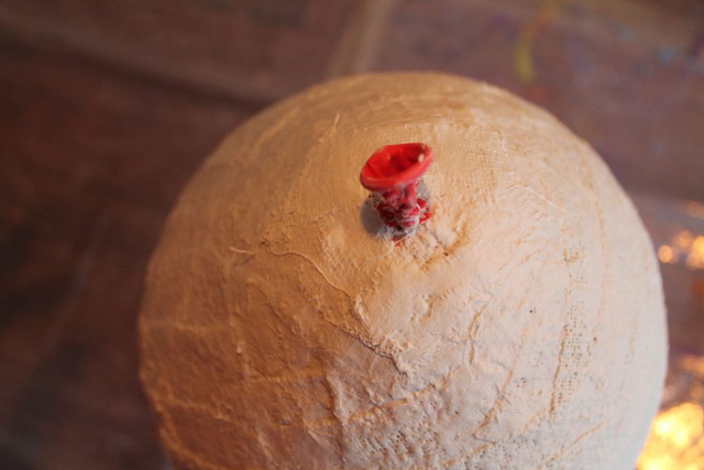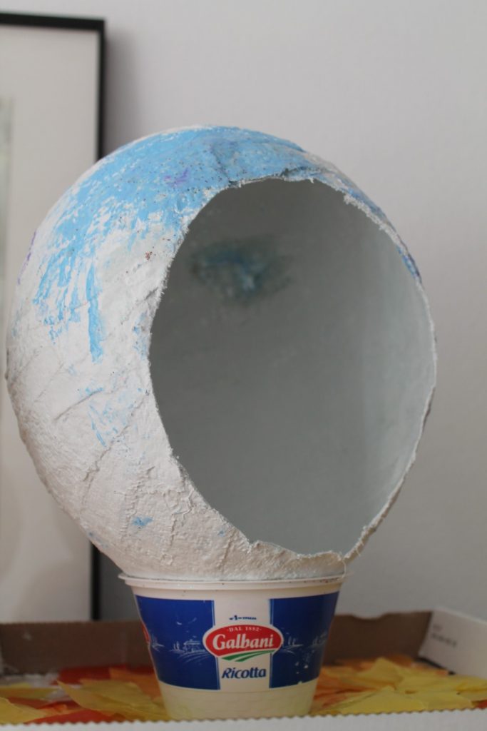 2. Nun blast Ihr den Luftballon auf und verknotet ihn. Gerne könnt Ihr Euch hierbei auch von einem Erwachsenen helfen lassen. Und jetzt geht es auch schon los: Ihr taucht die Gipsstreifen in Wasser und beklebt damit den ganzen Luftballon. Am Ende sollte man – außer dem Luftballonknoten – nichts mehr vom Ballon sehen. Nun könnt Ihr den Luftballon auf einen Becher o.ä. stellen und ab und zu umdrehen, so dass alle Seiten gut trocknen können. Das dauert ungefähr einen Tag.