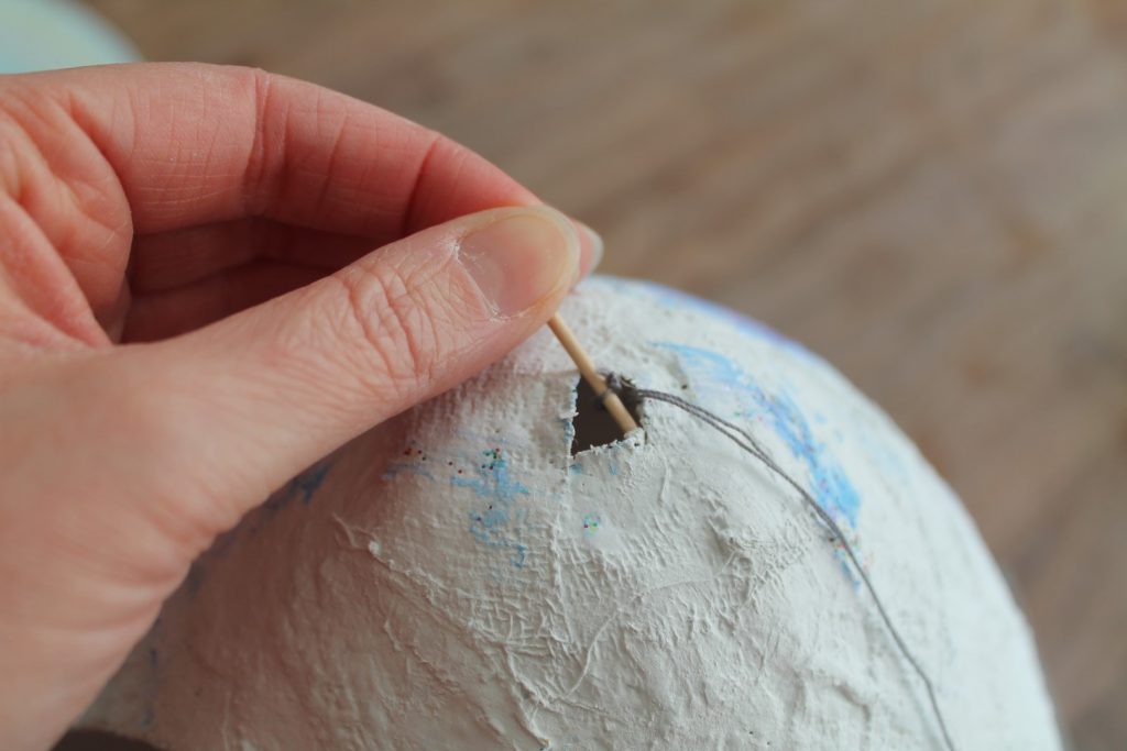 4. Euer Riesen-Osterei ist nun fast fertig. Wenn Ihr Lust habt, könnt Ihr es noch bemalen oder bekleben und erneut trocknen lassen. Nun ist es endlich Zeit das Osterei aufzuhängen. Hierzu schneidet Ihr Euch ein Stück feste Schnur in der gewünschten Länge zurecht und knotet ein Ende an einen Zahnstocher oder ein Streichholz fest. Das Hölzchen schneidet Ihr etwas länger als der Durchmesser des Lochs zurecht und steckt es durch die Öffnung.