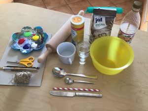 Hierfür schneidet Ihr aus einem Karton Eure gewünschte Form aus, wir haben uns für ein Osterei entschieden. Diese Vorlage legt Ihr dann auf den Salzteig und fahrt vorsichtig mit einem Brotmesser drum herum. Am besten sollen Euch bei diesem Schritt Eure Eltern helfen.