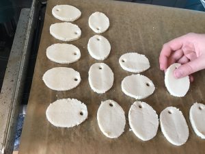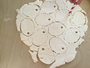 Damit Ihr die Deko später aufhängen könnt, stecht Beispielsweise mit einem Strohhalm Löcher in den Salzteig.