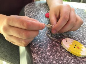 Wenn Ihr alle Eier bemalt habt, müsst Ihr nur noch kurze Stücke von der Schnur abschneiden, durch das Loch fädeln und verknoten.
