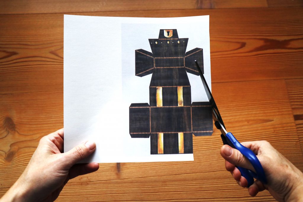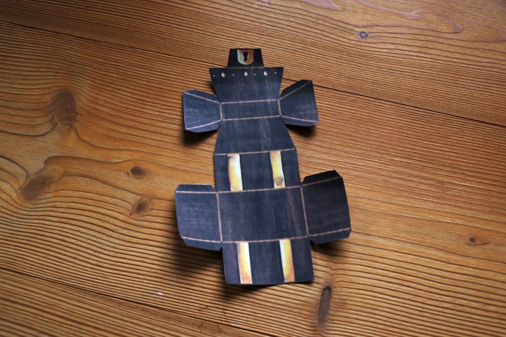 Im ersten Schritt druckst Du die Vorlage Schatztruhe aus und schneidest entlang des dunkelbraunen Randes, bis die Kiste vollständig ausgeschnitten ist.