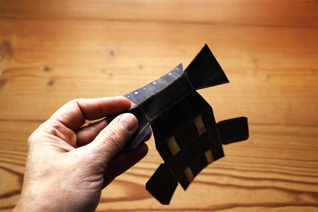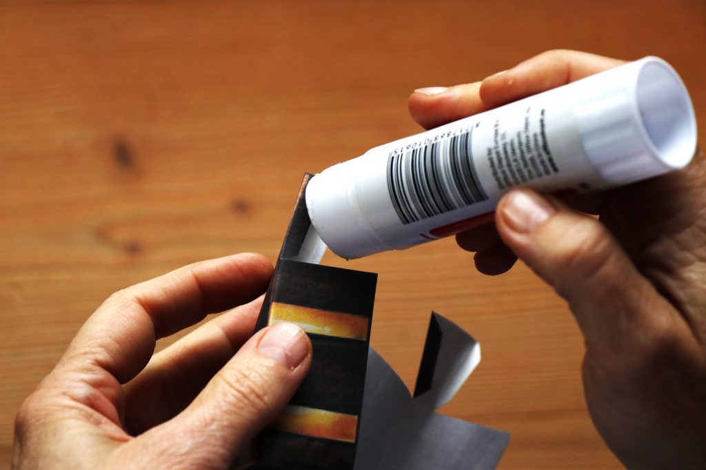Als nächstes faltest Du alle Teile entlang der hellbraunen Linien nach innen (Richtung unbedruckter Seite).