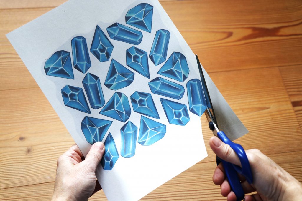 Jetzt druckst Du die Vorlage Diamanten aus und schneidest jeden Stein einzeln aus.