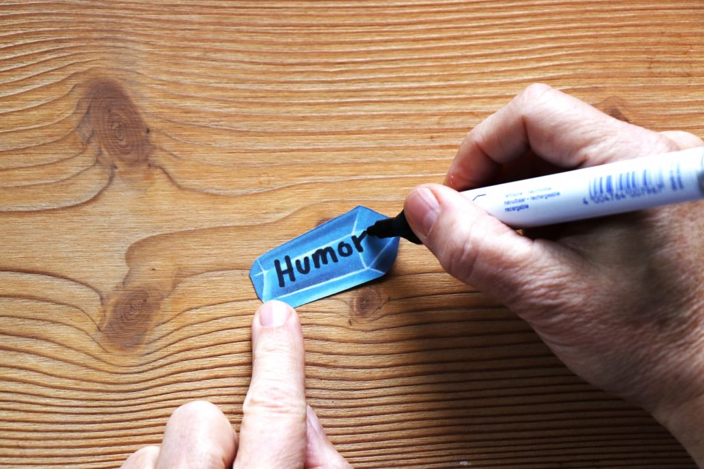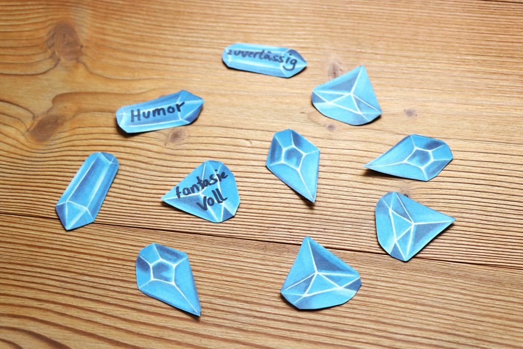 Mit einem dicken Stift schreibst Du das, was Du an Dir magst, Deine positiven Eigenschaften und Fähigkeiten auf die Diamanten. Vielleicht wollen Deine Liebsten auch noch einen Stein für Dich beschriften. Ihnen fallen bestimmt noch ein paar Deiner besten Eigenschaften ein.