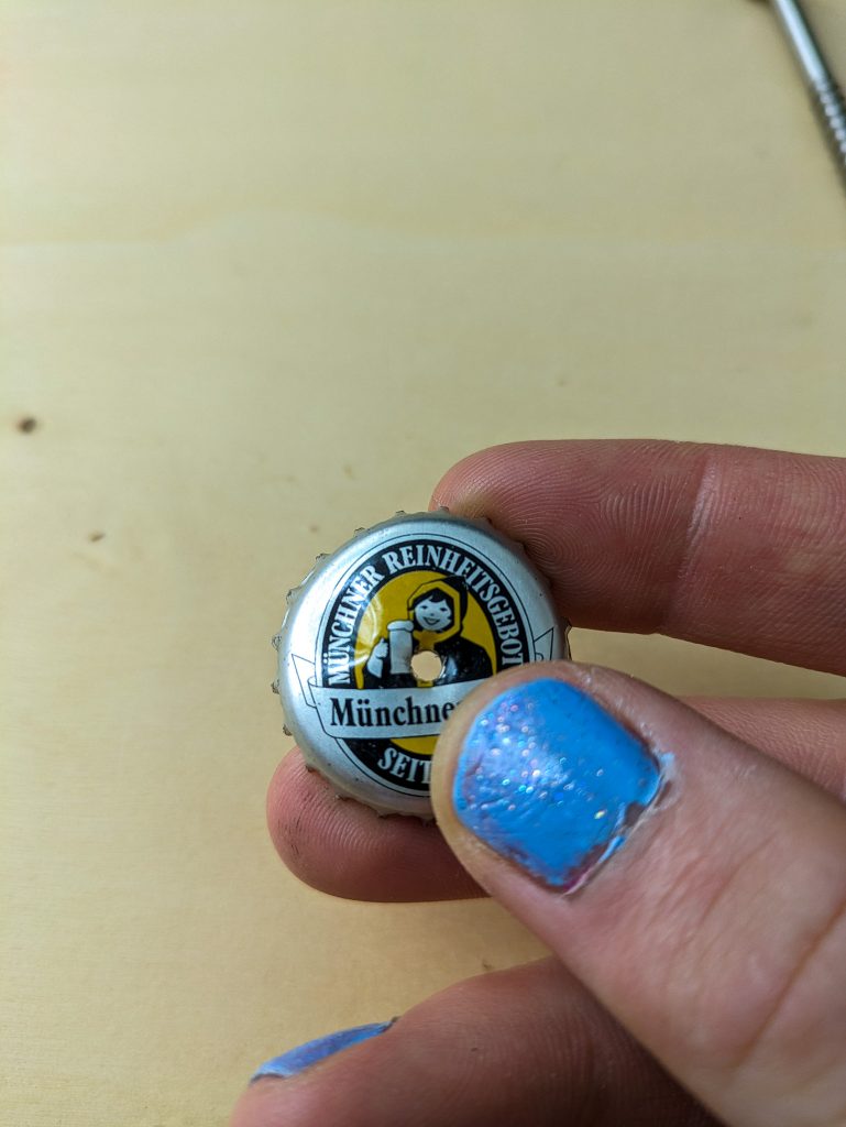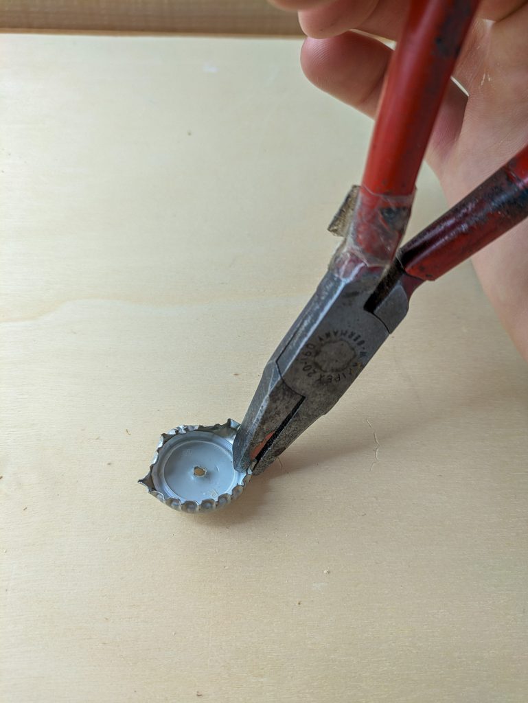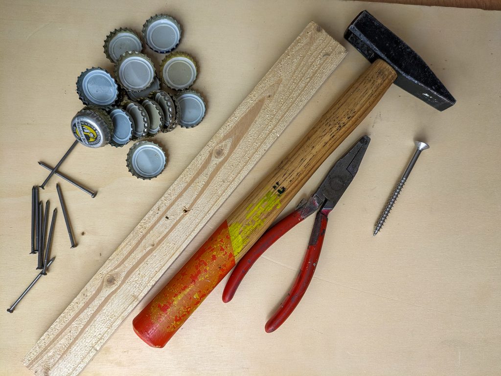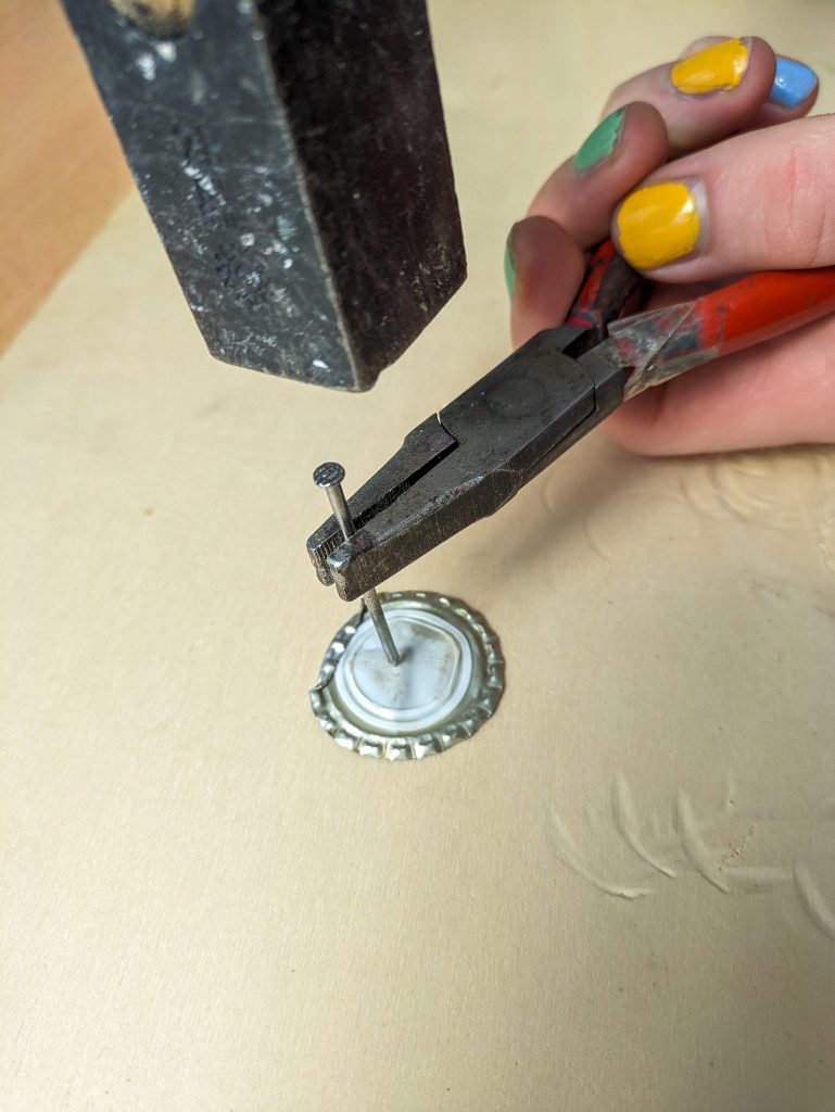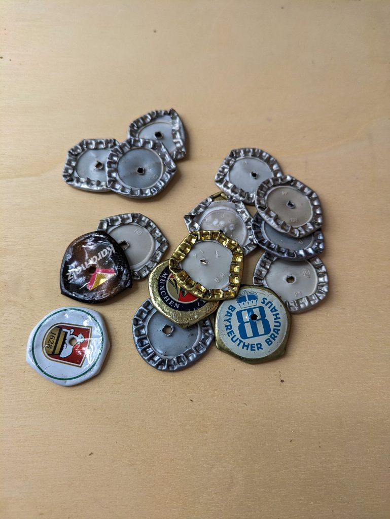 Zuerst haut Ihr in alle Kronkorken mit einem Nagel ein Loch. Die Kronkorken müssen dann noch flach gehämmert werden oder Ihr verwendet eine Zange.