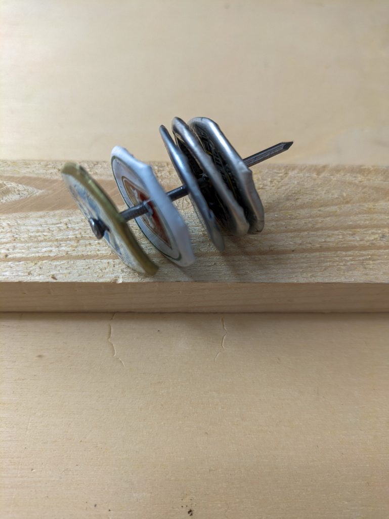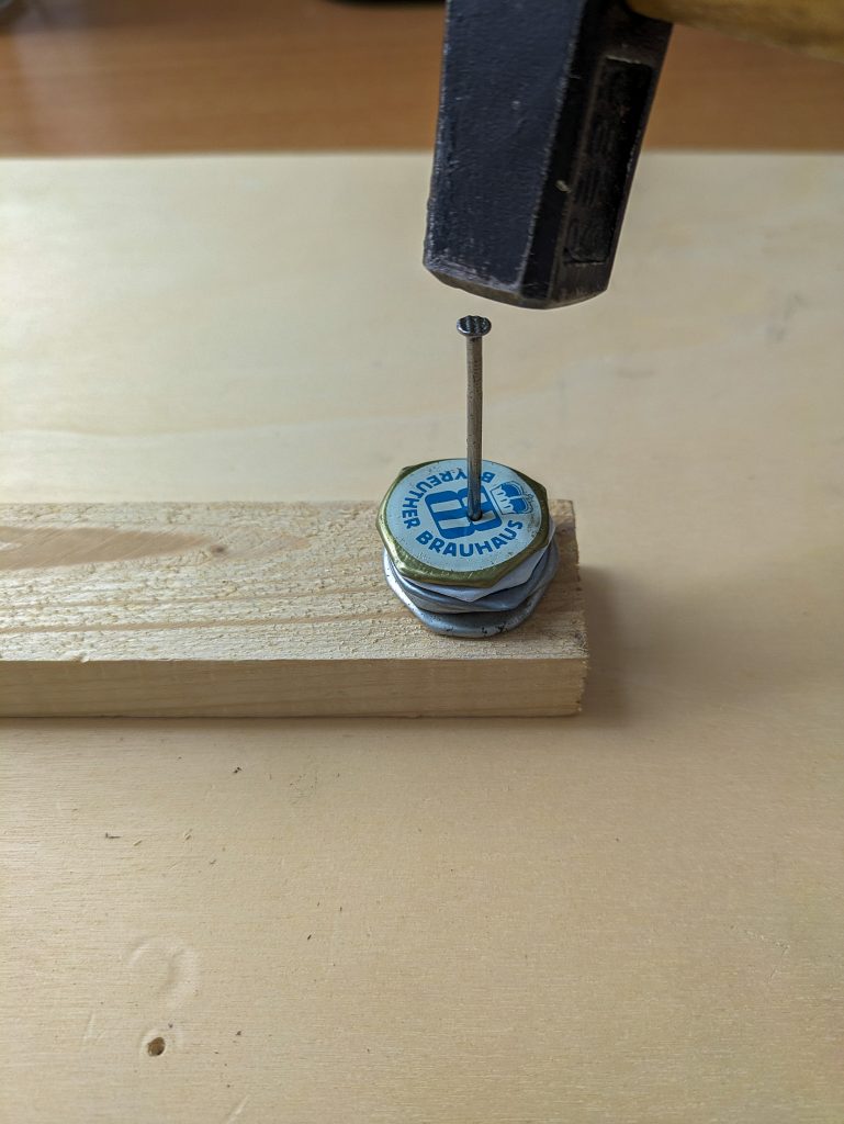 2. Fädelt fünf der Kronkorken auf einen Nagel auf und hämmert den Nagel mit den Kronkorken in das Holz. Achtet darauf, dass zwischen den Kronkorken noch Platz ist, so dass diese gut schellen können.