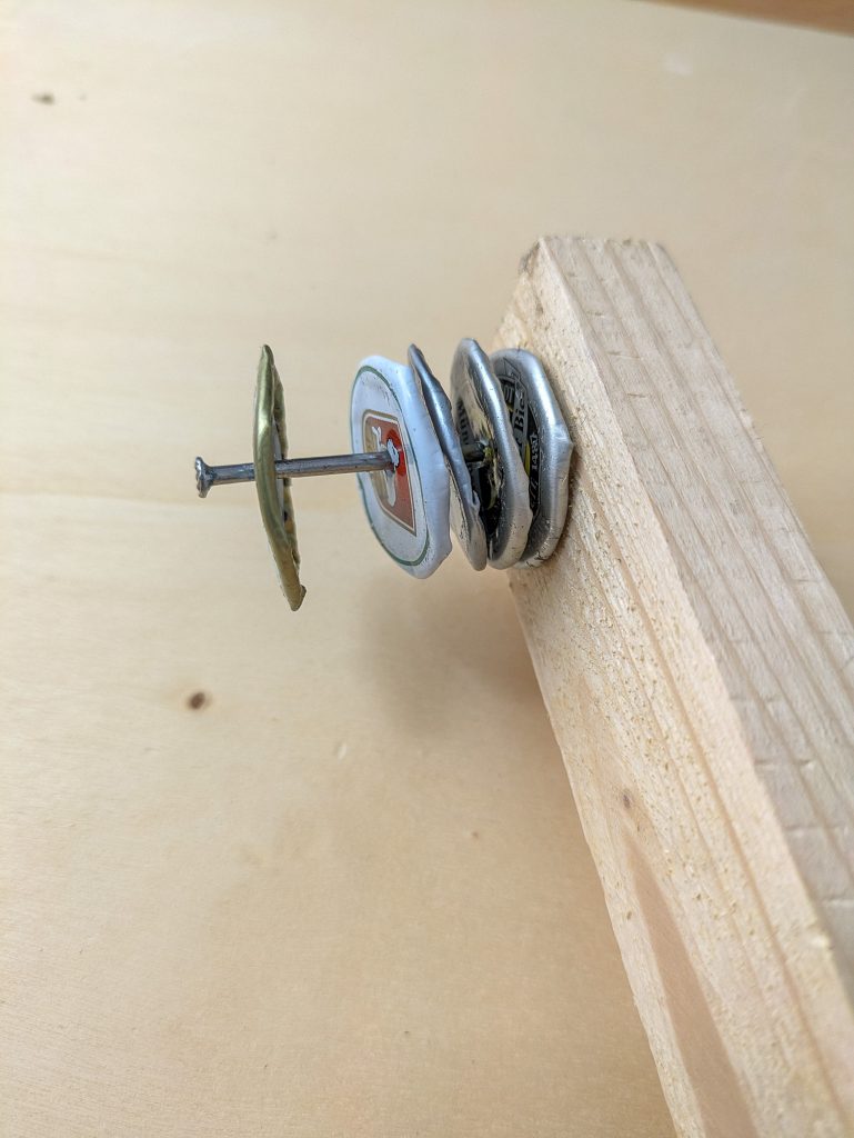 3. Den Vorgang wiederholt, so dass insgesamt alle Kronkorken auf die Nägel verteilt am Holz befestigt sind.