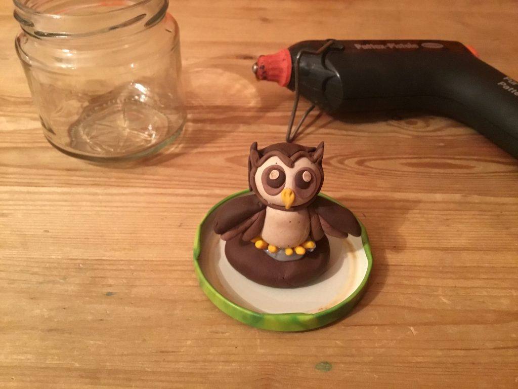 3. Klebt die Figur jetzt innen auf den Deckel von dem Schraubglas. Lasst Euch hierbei am besten auch helfen.
