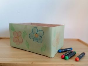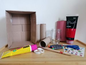 1. Zuerst beklebt Ihr den Karton von außen mit buntem Papier. Ihr könnt den Karton auch direkt bemalen. Dann könnt Ihr den Karton nach Eurer Fantasie frei gestalten.