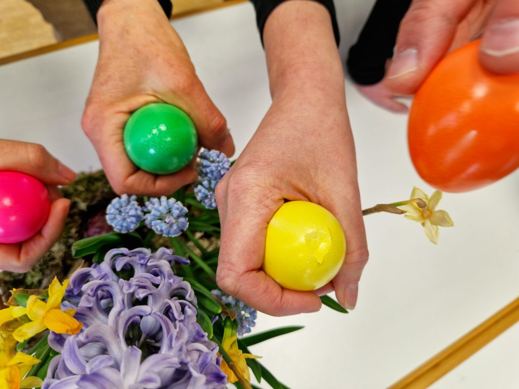 3. Die restlichen Eier werden nun zur großen Freude aller beim „Ostereierschlagen“ verwendet. Dazu schlagen die Teilnehmer*innen in Zweierteams die Eier erst „Spitze an Spitze“ auf und danach die andere, untere Seite der Eier. Das Ei, dessen Schale nicht zerbrochen ist, gewinnt.