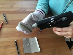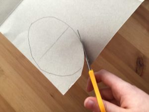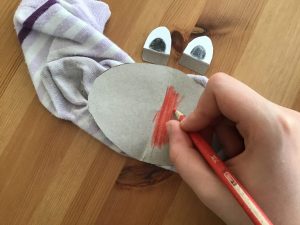 Schneidet zuerst aus einem Karton ein Ei für den Mund aus und klebt diesen mit Heißkleber an der Socke fest. Lasst Euch hierfür am besten von Euren Eltern helfen.