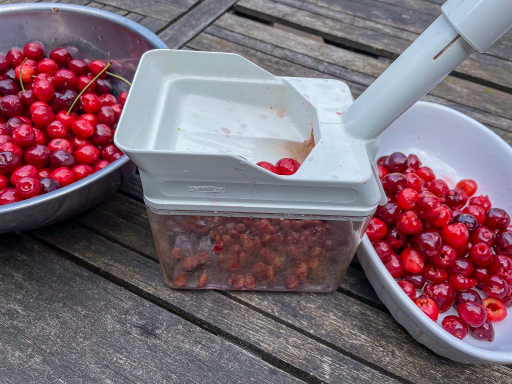 Die Kirschen könnt Ihr auch gut mit einem Gerät entsteinen. Dann müssen die Kirschen nicht mehr zerkleinert werden.