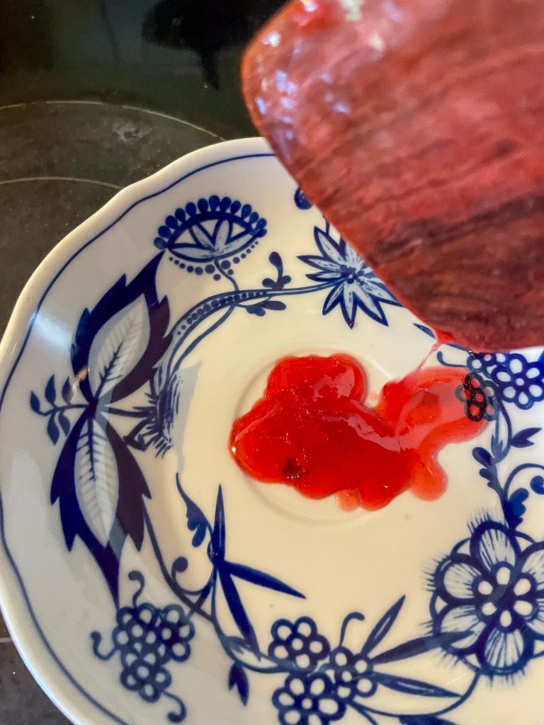 Wenn das Obst ca. vier Minuten leicht sprudelnd gekocht hat, könnt Ihr mit dem Löffel eine kleine Probe auf einen Teller tun, um festzustellen, ob es schon genug geliert.