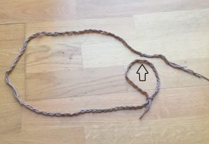 Jetzt könnt Ihr noch Zügel machen. Dazu macht Ihr einen langen Zopf (ca. 80 cm). An einem Ende macht Ihr eine Schlaufe, die einmal um die Nase Eures Pferdchens geht. Das andere Ende knotet Ihr an der markierten Stelle an.
