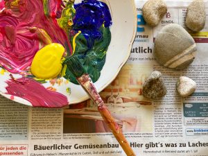 - Bunte Farben (entweder wasserlösliche Farben oder wasserfeste Farben – je nachdem was Ihr mit den Steinen vorhabt)