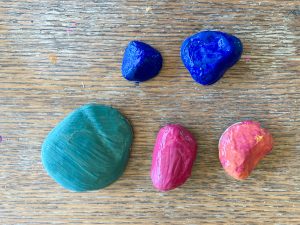 2. Entscheidet Euch, was Ihr gerne auf die Steine malen wollt. In das flache Gefäß könnt Ihr dann Eure Farben füllen und vielleicht auch mischen – wie Ihr gerne möchtet. Anschließend malt Ihr alle Steine in einer Grundfarbe an (z.B. blau, grün, rot) und wartet bis die Farbe wirklich getrocknet ist.