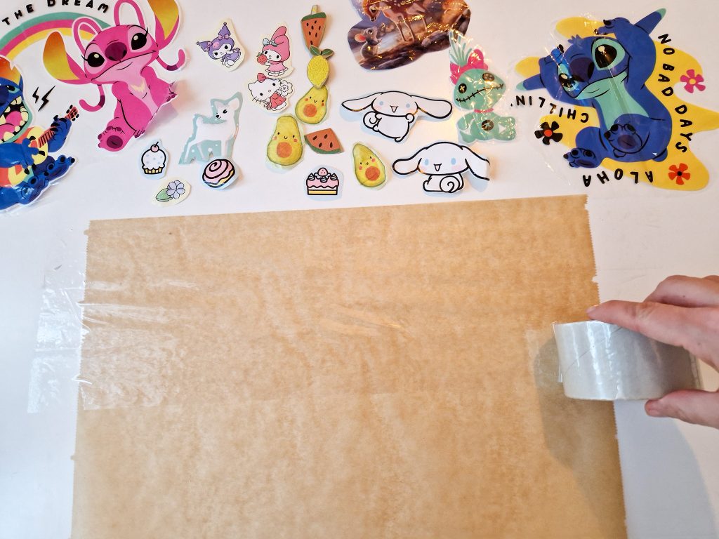 3. Platziert die Motive nun auf dem vorbereiteten Backpapier und lasst dabei genügend Abstand zwischen ihnen. Anschließend klebt Ihr wieder Klebestreifen über die Motive (siehe Schritt 2).