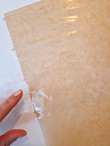 2. Jetzt befestigt Ihr das Backpapier auf Eurer Unterlage mit breitem Klebeband. Klebt die Streifen so, dass links und rechts das Backpapier fest auf der Unterlage hält und nicht verrutschen kann.