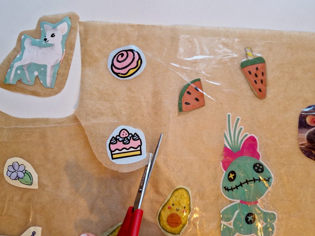 Schneidet die Motive einzeln mit einem großzügigen Backpapier-Rand aus. Das ist wichtig, damit Eure Sticker nach dem Ausschneiden nicht auseinanderfallen. Später wird der Rand übrigens nicht auffallen.