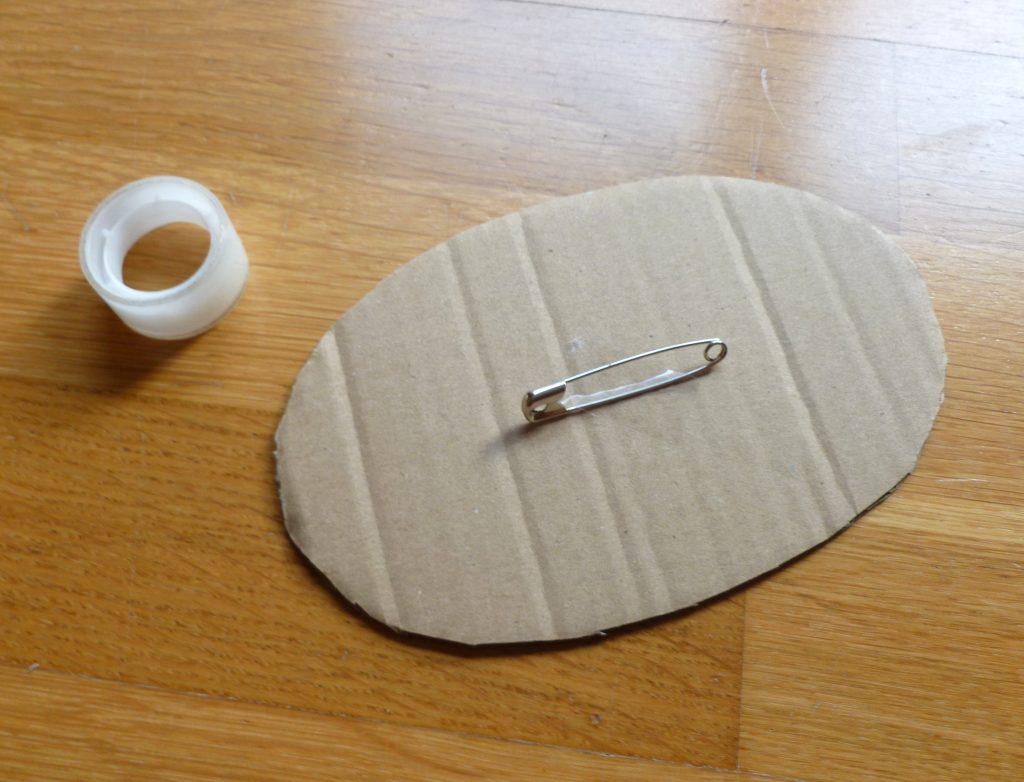 Jetzt klebst Du mit einem Klebestreifen die Sicherheitsnadel auf die Rückseite.
