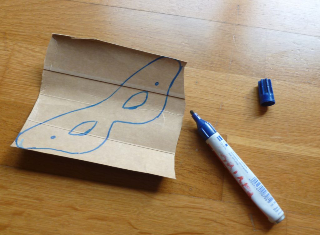 Ein*e Superheld*in braucht außerdem eine Maske: Male auf den dünnen Karton die Umrisse Deiner Maske. Eine Schablone kannst Du Dir hier herunterladen.