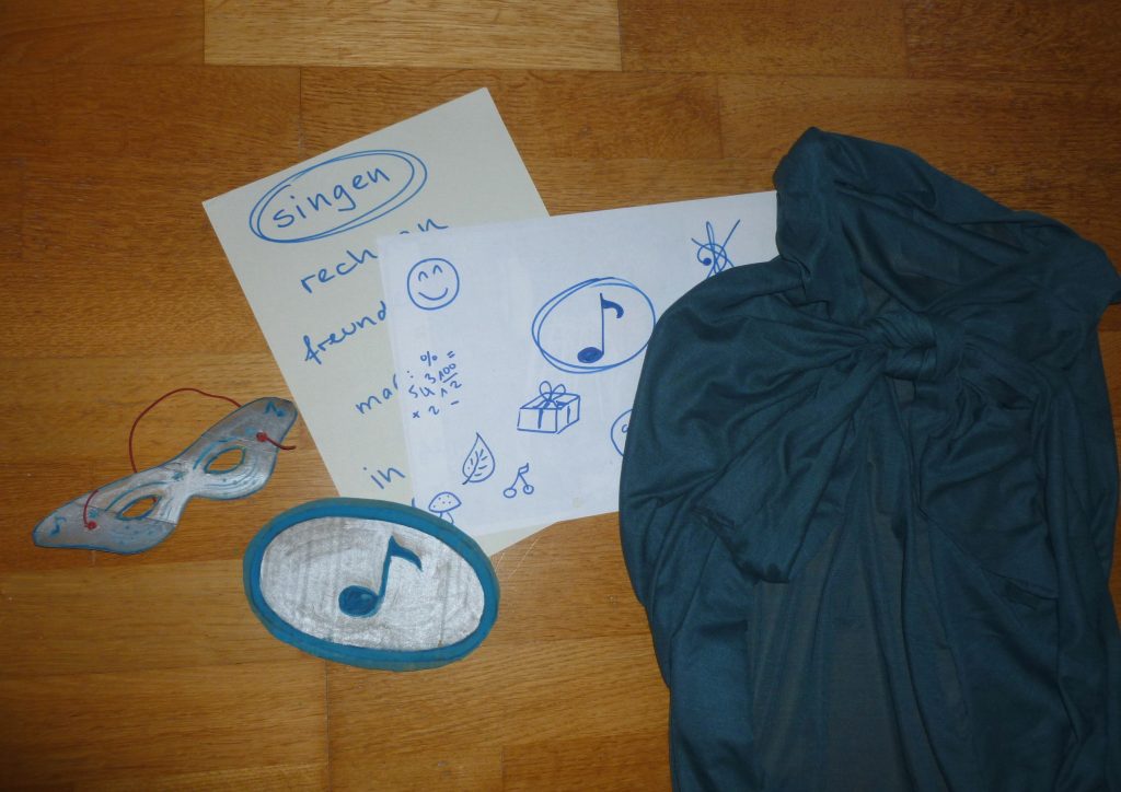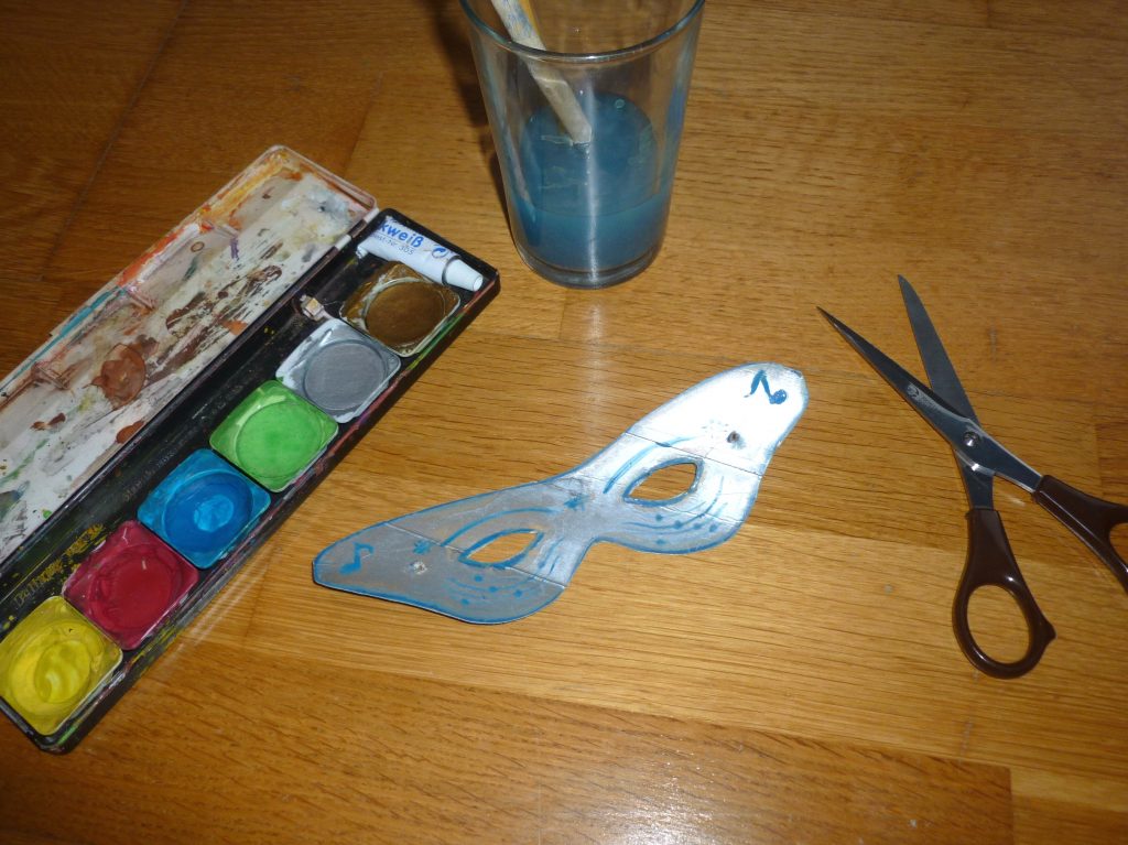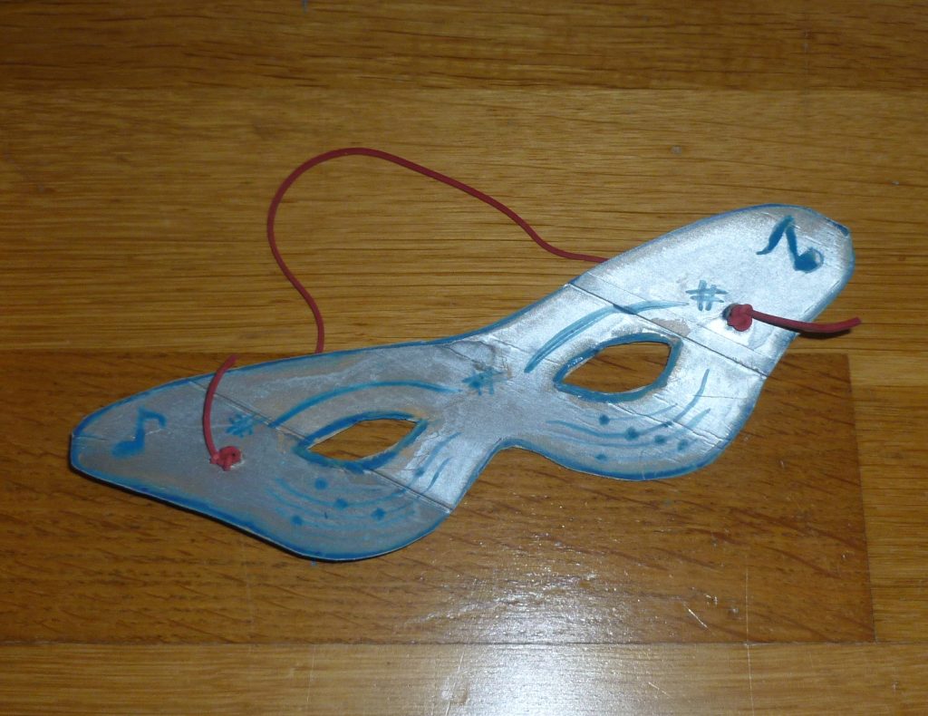 Schneide die Maske aus und bohre Löcher für den Gummi vor. Den Gummiring schneidest Du auf und knotest ihn an Deine Maske.