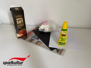 Nun klebt Ihr auch die Watte an den Tetrapak.