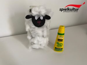 Schneidet den Kopf und die Ohren des Schafes aus dem schwarzen Papier aus. Die Augen werden aus dem weißen Papier ausgeschnitten. Klebt alles zusammen und malt auf den Kopf noch eine Nase hin. Wenn Ihr möchtet, könnt Ihr noch Watte auf den Kopf kleben.