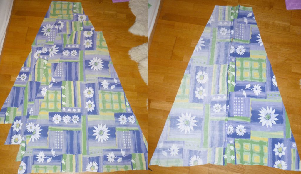8. Jetzt kannst Du die Tipi-Planen mit den schrägen Seiten links auf links aneinander nähen.