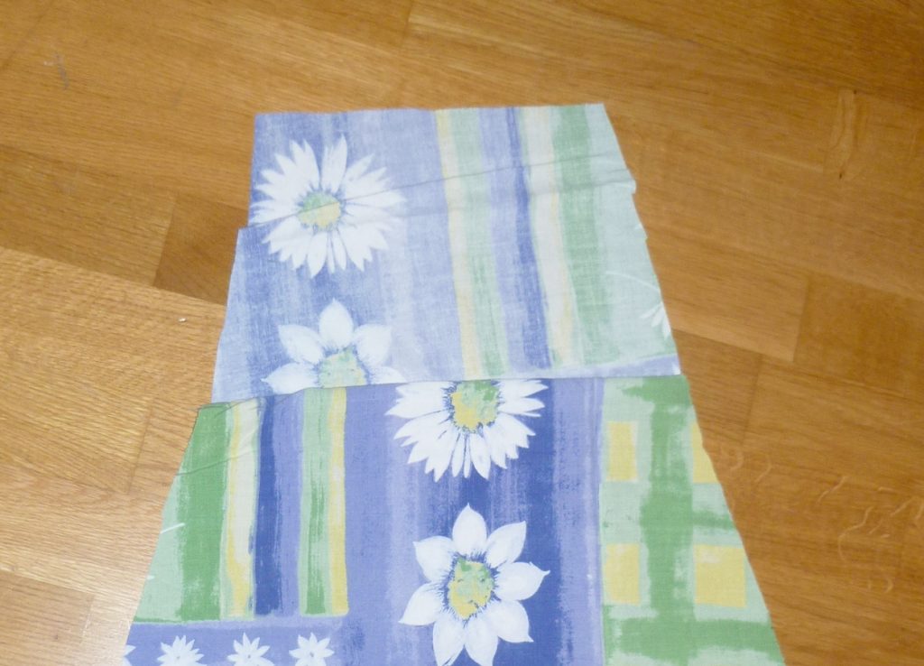 5. Schneide an den schrägen Linien entlang. Dann solltest Du vier gleich große Stoffteile haben und zwei, die zusammen geknöpft ein großes Teil ergeben.