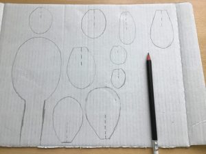 Als erstes malt Ihr auf das Stück Pappe ein ovales Ei, auf das unten ein längliches, schmales Rechteck folgt. Das wird später der Hauptteil des Kaktus, den Ihr in den Blumentopf steckt. Die restlichen Teile werden dann zu diesem Teil dazu gesteckt.