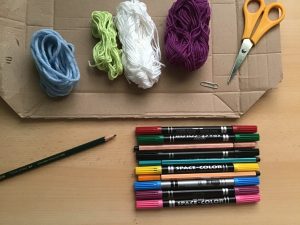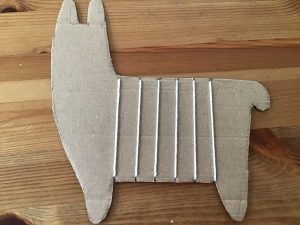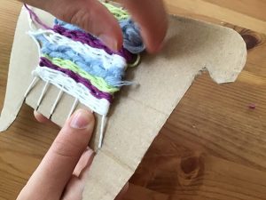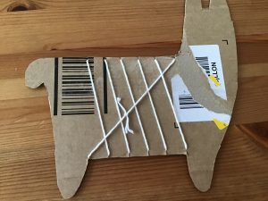 Das Tier bespannt Ihr dann mit einem Faden, den Ihr durch die kleinen Schlitze führt. Auf der Rückseite knotet Ihr den Anfang und das Ende der Schnur zusammen. Das ist nun Euer Webrahmen.