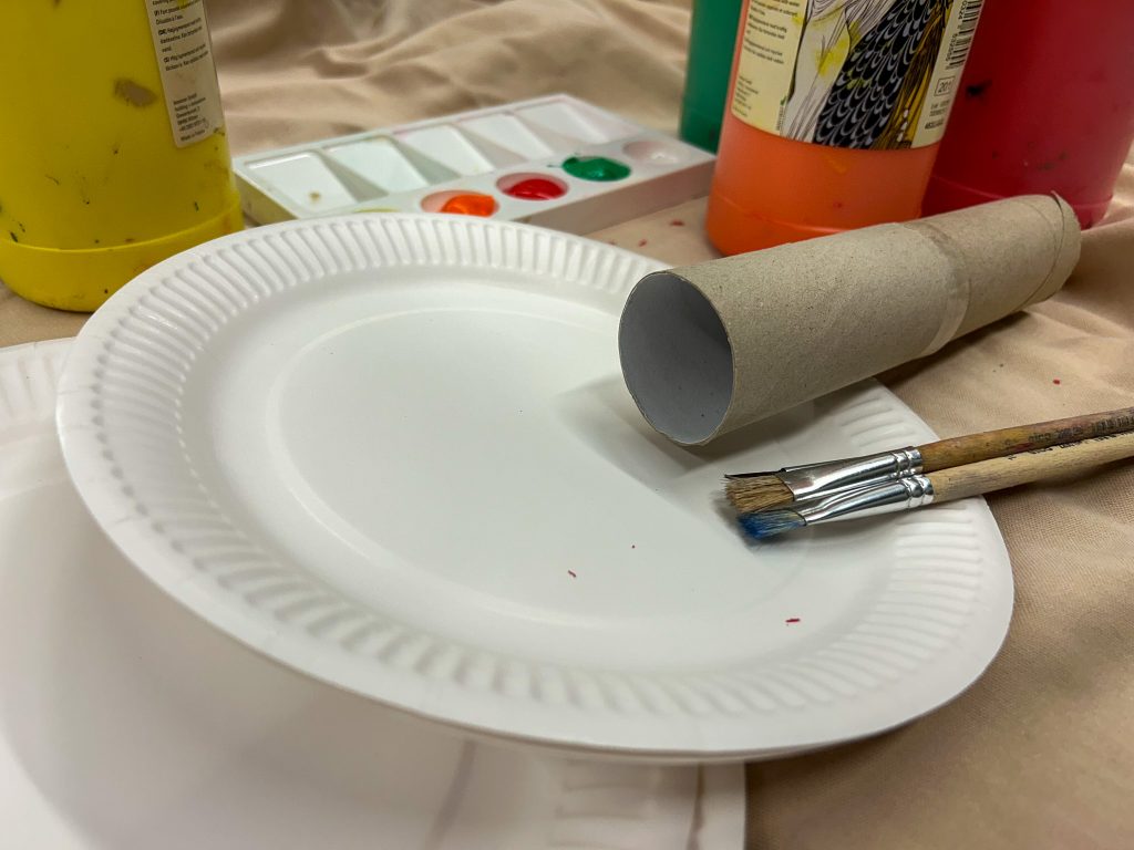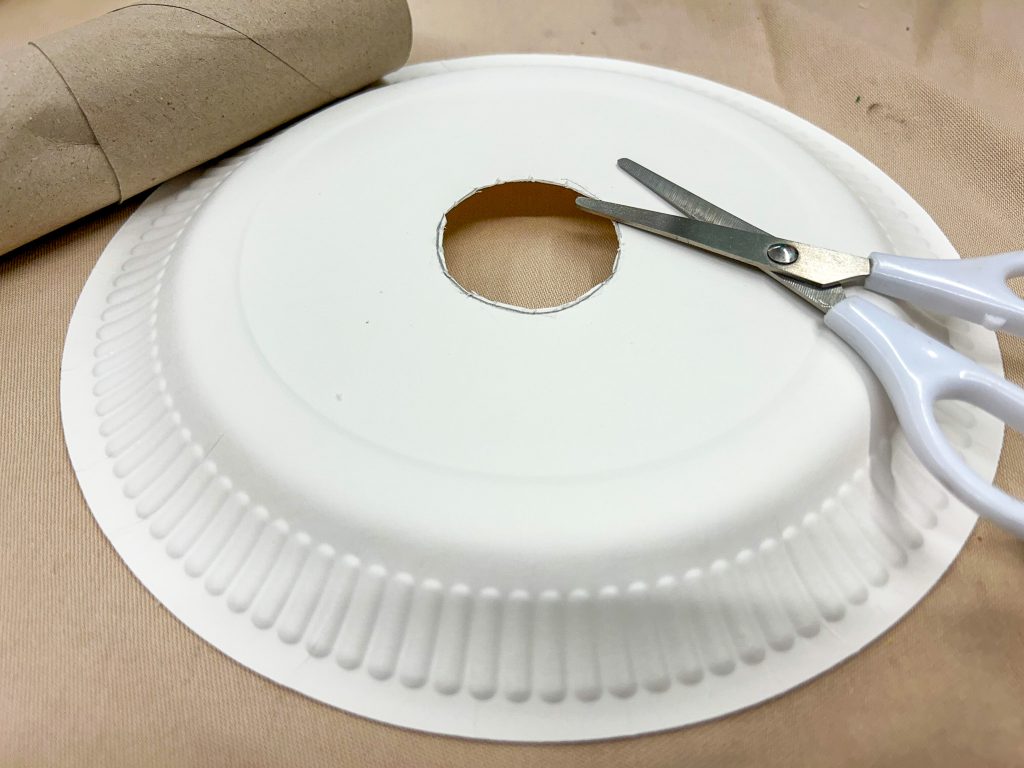 Das Wurfziel wird aus einer leeren Küchenrolle gebastelt. Für diese braucht Ihr noch eine Befestigung, damit sie gerade stehen kann. Dafür zeichnet Ihr in der Mitte eines weiteren Papptellers einen Kreis um die Küchenrolle, die Ihr später als Ziel verwenden möchtet. Im Anschluss schneidet Ihr das Innere dieses Kreises aus.