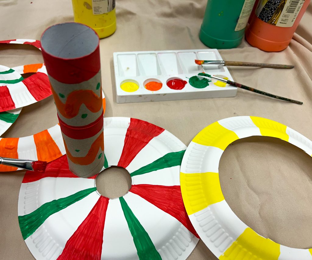 Jetzt könnt Ihr kreativ werden. Gestaltet Eure Wurf-Ringe und die Küchenrolle mit Mustern und Farben Eurer Wahl. Ihr könnt auch mehrere Pappteller in ähnlichen Farben/Mustern bemalen, um später in Teams zu spielen.