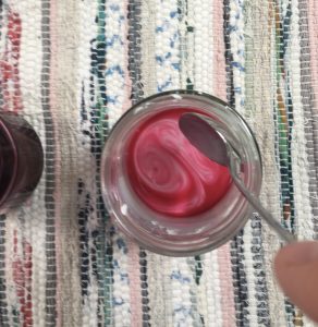 Jetzt gebt Ihr entweder ein paar Tropfen Lebensmittelfarbe hinzu oder färbt mit natürlichen Mitteln. Für die Rote Farbe eignet sich Rote Beete Saft sehr gut.